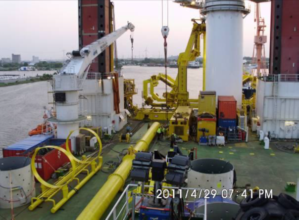 Die Bauteile der Windkraftanlagen werden von Supply-Schiffen und Bargen zum Windpark angeliefert. Die Fundamentrohre werden mit der sogenannten Schablone am Heck und dem 500 t Kran exakt im Meeresboden positioniert. Anschließend werden sie mit dem 200 t schweren Rammhammer in den Boden getrieben und das 450 t wiegende Stützkreuz aufgesetzt. Danach werden der Turm, die Gondel und der Rotorstern mit 122 m Durchmesser installiert.