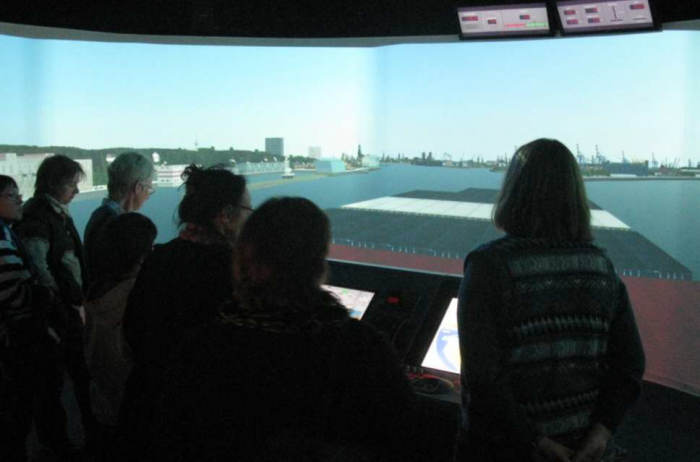 Nach dem Frühstück in der Herberge fuhren wir alle nach Warnemünde. Dort gab es eine Führung durch den Schiffsführungs- und Maschinen-Simulator der Hochschule für Nautik und Seeverkehr. Dies ist einer der ganz wenigen Simulatoren, bei dem Übungen für Nautiker und Maschinisten kombiniert werden können. Entsteht zum Beispiel im Maschinen-Bereich ein Fehler, kann dies auf der Brücke zu Ausfällen führen.